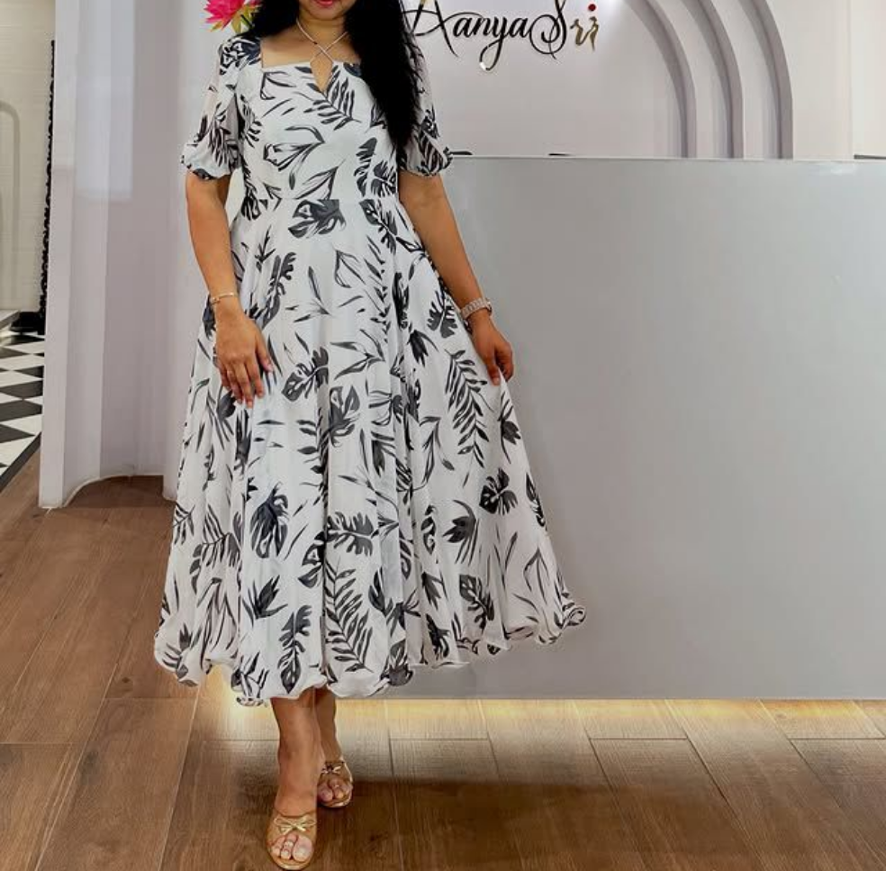1469 WHITE & BLACK LEAF 🖤 🤍 Step into a world of elegance and charm with our enchanting Floral Midi Dress. This beautiful dress features a delicate hue adorned with a captivating floral print, it ensures comfort while keeping you stylish all day long.The dress showcases a flattering fit-and-flare silhouette, with a well-fitted bodice and a flowing, tiered skirt that adds a hint of whimsy to your look. The short sleeves and neckline enhance the feminine appeal, making it a versatile choice for both casual outings and special occasions.Details✓Material : Fox Georgette ✓ Complete Linning ✓Sleeves : Short Sleeves ✓Length : 48 inchSize Happy Shopping 😁🛍️ *YOU DESIRE ❤️ WE DELIVER 🎁*